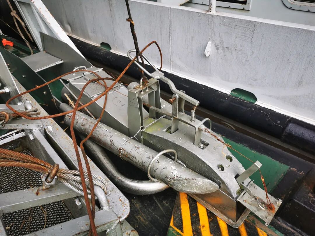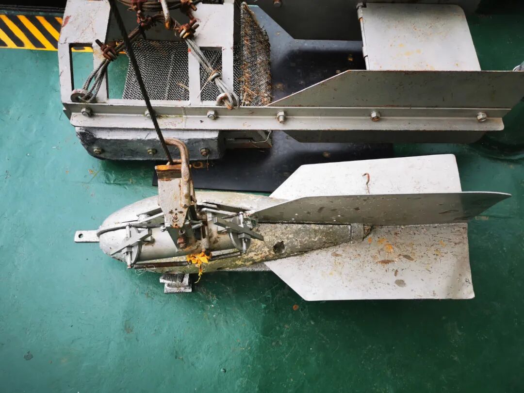 ( v/ F, \" O( j1 h6 g; D8 B 这个长得像“鱼雷”一样的仪器是悬沙采样器。采样时,张开筒盖,水流从筒中流过,然后操纵开关,借弹簧拉力将筒盖关闭,采集瞬时的悬沙水样。