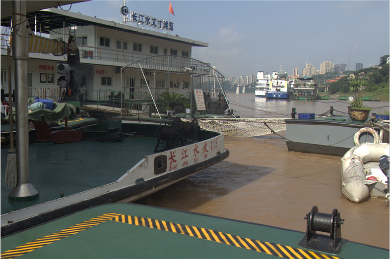 % T5 h% B1 I9 U5 z! x2 `2 B, Z 早上七点三十分,寸滩水文站助理工程师谈语就早早到达长江水文寸滩趸船,准备开始今天的第一次测量。每天进行的测量对于谈语他们来说轻车熟路。穿救生衣、开船、放仪器、取样……一个多小时,一次惯常的测量就结束了。 3 P' {+ J0 e9 T; L9 ^( r4 h- v
