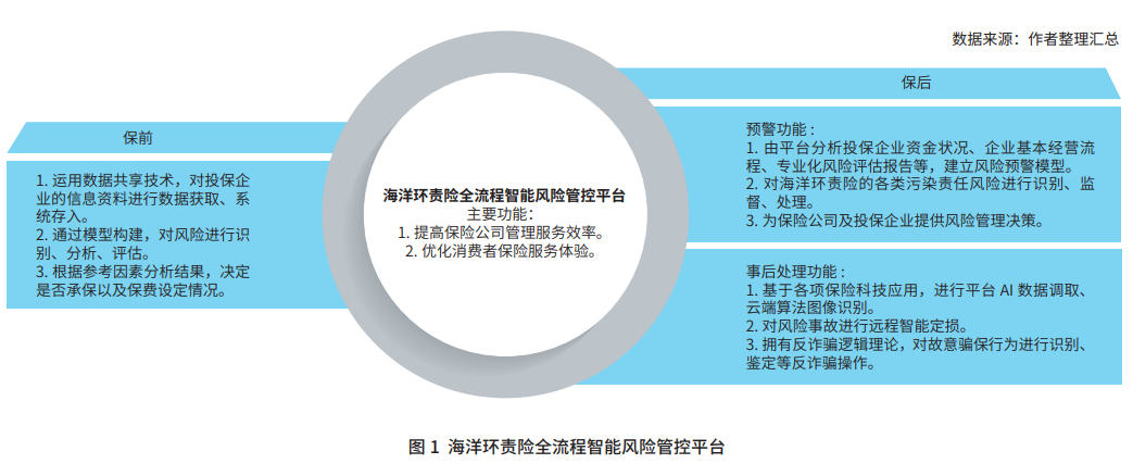 |# N a" g. E" G, ]# T 1.完善立法,唤醒保险市场进行供给侧革新 完整的法律体系是实现海洋环责险健康稳定发展的最大保障。借鉴德国经验建立相关的污染预防、付费原则,对于违反者惩罚务必严格,使企业在发生环境污染事故后所遭受的惩罚可能会超过造成的环境污染损失及侵害责任,这不仅有利于增强企业在生产运作过程中的环境保护意识,更有利于提高企业投保的积极性。不仅如此,还应加强其他污染领域的法律建设,如针对各种废弃物、污水排放等建立排放指标,这部分立法建设有利于保险公司进行险种的创新,开发海洋环责险的污水排放指数保险等。此外,还可以通过立法将海洋环责险作为政策性保险进行经营,考虑将环境污染连带责任纳入立法范畴,实现海洋环责险保障程度的最大化,提高市场供给的质量和效率。目前,通过建立专门的海洋环责险经营公司来经营政策性环责险的条件还不成熟,其对资金和人力要求非常苛刻,可以考虑先由政府出资委托大型保险公司暂时经营管理。2.加强科技赋能风险管理,提升保险市场供给效率保险企业可以运用云计算、大数据、人工智能等保险科技手段搭建全流程的智能风险管控平台,通过对投保企业的资料进行深度学习、数据挖掘分析,制定更合理的风险管理体系,对事后技术评价适时地进行动态分析反馈。相较于传统的风险管理模式,无论是分析深度,还是分析准确度,都将得到大幅度的提高。海洋环责险全流程智能风险管控平台(如图1),以大数据、云计算、人工智能为核心,构建风险管理内部处理体系。在承保前,该平台可以运用数据共享技术,对投保企业的信息资料进行数据获取、系统存入,对投保企业投保不同类型的海洋环责险进行相应风险识别、分析、评估,通过建立模型,参考投保企业的基本信息、资金状况、风险类型及性质、事故发生后污染程度、具体经营流程等因素,来分析决定是否承保以及保费设定情况。在承保后,该平台的主要功能是进行风险事故预警及事后处理。对于预警功能,具体执行情况是由平台分析投保企业资金状况、企业基本经营流程、专业化风险评估报告(来自第三方风险评估机构)等建立风险预警模型,对海洋环责险的各类污染责任风险进行识别、监督、处理,并为保险公司及投保企业提供风险管理决策,同时,上传数据至生态环境部,协助其实行监管。对于事后处理功能,全流程智能风险管控平台通过平台AI数据调取、云端算法图像识别等方法,实现对污染责任线上智能定损,为了防止道德风险,考虑平台加入反诈骗逻辑理论,对故意骗保行为进行识别、鉴定等反诈骗操作。在确认事故成因后设定理赔方案,降低人力支出、快速理赔,提高整体效率。