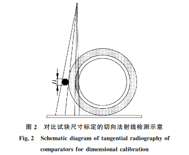 由于投影放大的原因,在检测图像上的影像会有所放大,放大倍数与焦距和管径(F/D0)的比值成反比。因此,不能直接以检测图像上的尺寸作为缺陷定量尺寸。一般情况下,需采用标定器进行尺寸标定,以校正由于射线源、管道和成像器件的透照布置引起的影像尺寸几何放大。标定器采用已知直径和公差的球型对比试件,放置在靠近管道的位置,与管道壁厚上的切线位置在同一个平面上,见图2。 / R/ l B1 A1 h) T$ S @