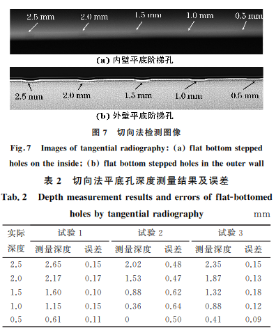 检测图像见图7,采用小球试块对尺寸标定后,用交互式方法测量管壁厚度和所有平底孔的深度,表2为测量结果及误差。 - }1 k, h/ g. ^0 o: U
