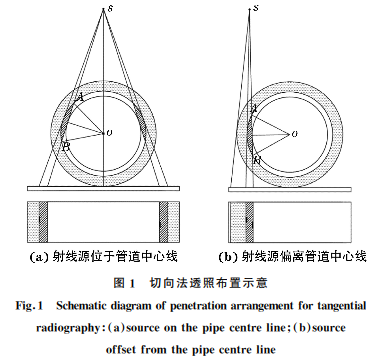 利用切向法 X 射线或 γ射线检测技术评估管道腐蚀状况,其核心原理在于测量管壁边界的壁厚变化。图1是切向法射线检测技术的两种透照布置方式,分别是射线源位于管道中心线的切向透照和射线源偏离管道中心的切向透照,其可在不拆保温层情况下检测。 : Z4 g, [( D/ I. h