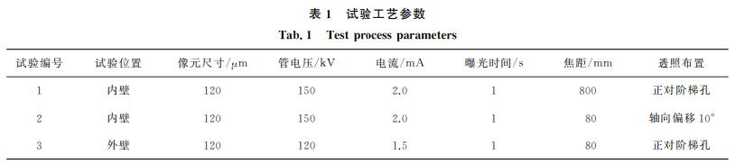 % Z3 r* u) J: X0 ?" B, p% A9 l' g: H8 w 试验设计模拟试样,规格为ϕ60mm×5mm,并在内壁/外壁刻一排ϕ5mm 阶梯孔,孔深分别为0.5,1.0,1.5,2.0,2.5mm。采用 X 射线数字成像系统对模拟试样进行检测,采用直径为10mm 的小球作为标定器,试验工艺参数如表1所示。 + w7 l3 X5 }, Z! ?
