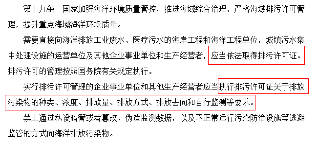 5 o; F2 m" I2 u& A6 b# J% G 4.入海排污许可 2017版海洋环保法中根本没有“排污许可”这个概念,企事业单位向海洋排污不需要环保部门的许可和关注,一副“劝你少管”的态势。2018年环境保护部出台了《排污许可管理办法(试行)》,后又更新了排污许可分类管理名录,还筹划着与环境影响评价联合深入改革,探索二证合一,在这项制度的创新和打磨上不断精进。2021年国务院颁布《排污许可管理条例》,要求排污单位依照该条例申请取得排污许可证,未取得排污许可证的,不得排放污染物,使排污许可制度成为环境管理的核心。国务院指定监管排污许可工作的机构,当然是环境保护主管部门。《排污许可管理条例》不区分向江河湖海哪里排污,适用范围默认是一切外环境,自然是包括海洋了,此番在2023版海洋环境保护法中言明,也是水到渠成、顺理成章的。 2023版不但要求向海洋排污要取得排污许可证,且要按证排污和自行监测,对违反相关的规定的,还有对应的罚则。“处二十万元以上一百万元以下的罚款”。配制相对齐全了。