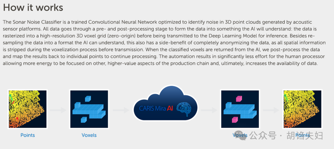 回归到本文的主题“国产海洋专业软件”的具体开发工作上,从海洋测绘和地球物理相关的专业软件来看,不夸张地说市场上60%是国外软件,30%是国外软件的盗版,剩下10%是国产软件以及研究人员用MATLAB编写的小计算工具,大部分仅限于研发人员自己操作,用于为论文提供数据支撑。显然在中国的科研评判机制中,短期内研究软件远没有研究算法有前景。但是如果一个专业方向想深入地做下去,也确实只有产品化一条路可以走,因为一套成熟的产品体系是进一步科研的根。还是以海图制图软件为例,Caris公司基于原有的软件产品体系,开展了很多人工智能相关的尝试,我们国内如果想做类似的尝试,几乎都是算法尝试层面的,与产业化只会越拉越远。 Caris Sonar Noise Classifier功能介绍,涉及深度学习的算法应用 ' q( f. M* K3 K' q" k" O+ V$ C/ U