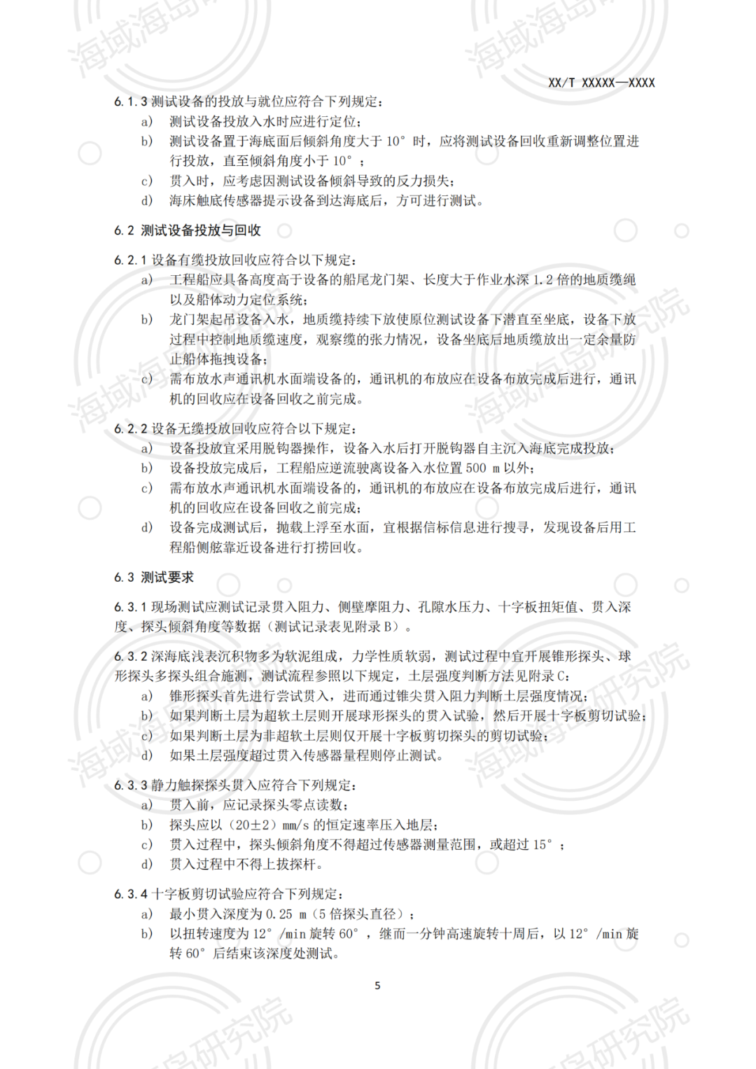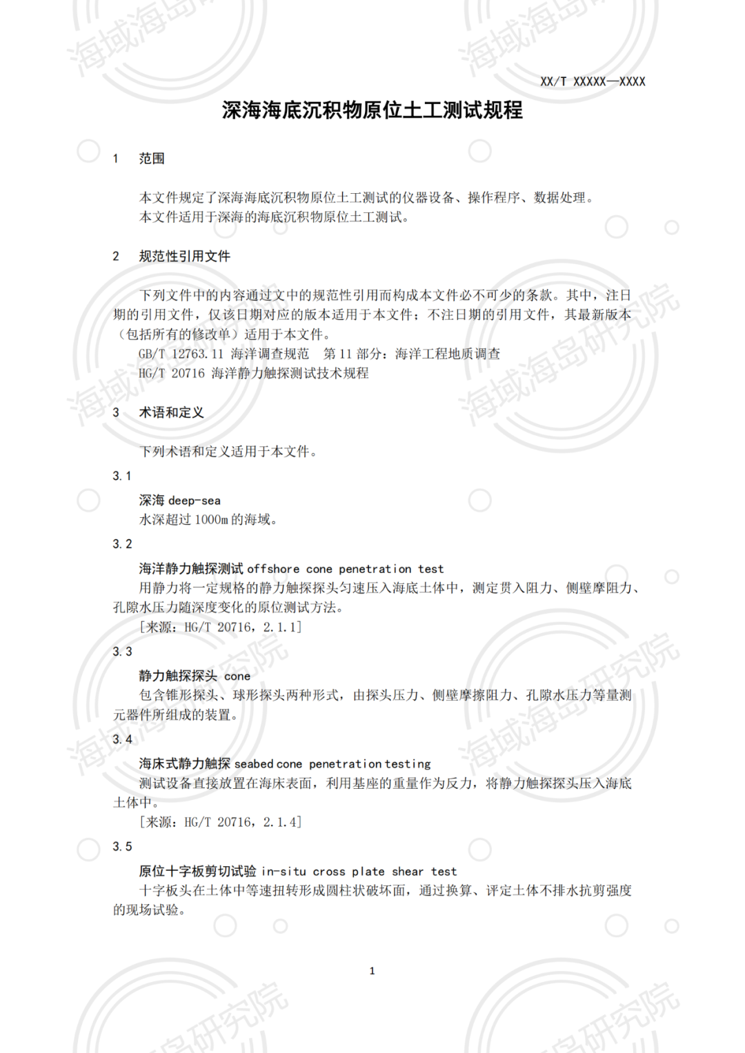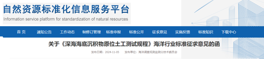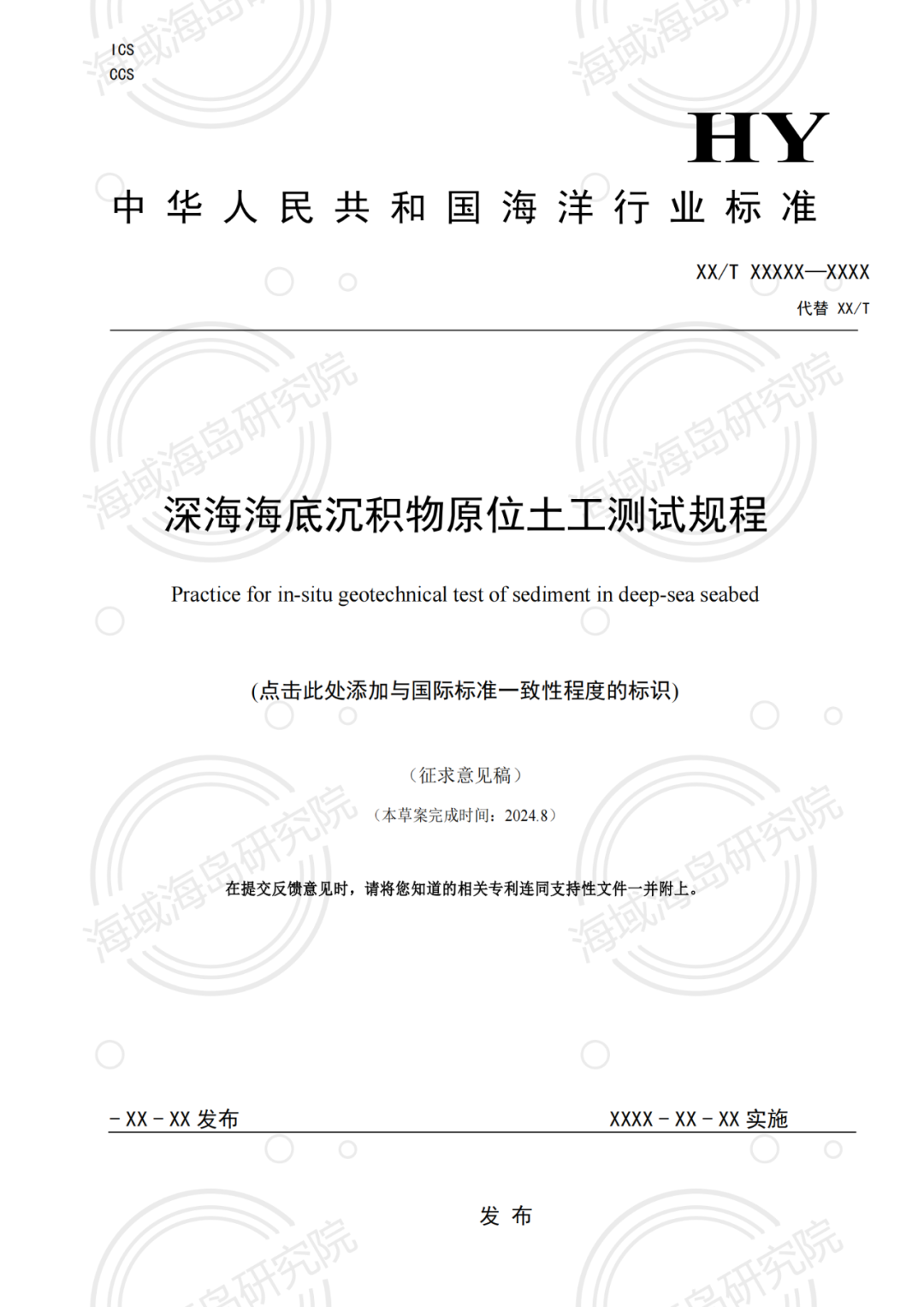 , G+ C( O2 f) q: v y 关于《深海海底沉积物原位土工测试规程》海洋行业标准征求意见的函各有关单位:《深海海底沉积物原位土工测试规程》海洋行业标准(计划项目编号:202222008)现已完成标准征求意见稿。根据《自然资源标准化管理办法》的有关规定,现公开征求意见。如有意见,请在平台在线填写反馈意见,或将意见以电子邮件形式反馈,截止时间为2024年12月4日。逾期不回复,视为无意见。感谢大力支持!联 系 人:吴春芳联系电话:13606516508传 真:0571-81963355电子邮箱:afang333@sio.org.cn下载:《深海海底沉积物原位土工测试规程》(征求意见稿).pdf《深海海底沉积物原位土工测试规程》(征求意见稿)编制说明.pdf意见反馈表.docx海洋调查观测监测分技术委员会2024年11月05日8 I* @. ]1 e& S) L& H3 v& p