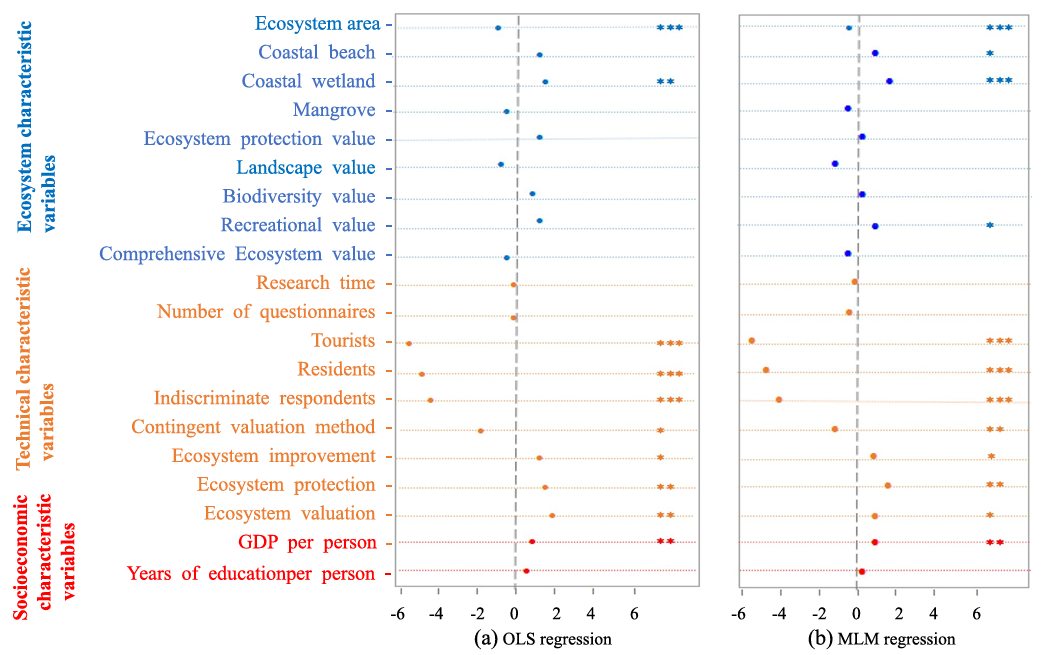 4 d( d5 U+ c b) t T' a 如图1所示,回归结果表明,生态系统特征(如生态系统类型和面积)、估值方法(如条件价值法和选择实验法)以及社会经济因素(如人均GDP和教育年限)在两种模型中均对估值产生显著影响。特别是MLM模型更清晰地反映出区域特征的影响。例如,沿海湿地和娱乐服务在多层次模型中的系数较高,表明其在区域层次上的估值稳定性。这些结果表明,公众对海洋生态系统服务的支付意愿受到多个维度的共同影响,其中区域经济水平和生态系统的特性起着关键作用。相比之下,MLM模型显示出比OLS更高的拟合效果,且误差较小,进一步表明MLM模型在处理区域差异和层级数据结构时的优势。这一结果为生态系统服务的估值研究提供了新思路,表明未来在进行生态系统服务估值时,采用多层次分析方法可以更好地控制区域特征对估值的影响,从而更精确地捕捉到支付意愿的驱动因素。