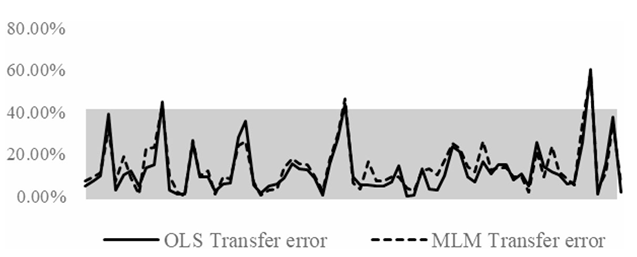 - U# W, c* |# q2 p 图2展示了OLS(普通最小二乘法)和MLM(多层次回归模型)在估值转移上的误差结果。研究采用72个观测值的完整样本来计算转移误差,结果显示OLS模型的平均转移误差为14.19%,MLM模型为15.69%。根据相关文献标准,如果转移误差低于40%,则模型被认为有效。在本研究中,两个模型的平均转移误差均低于20%,表明这两个模型在预测样本内估值方面具有较高的有效性和准确性。