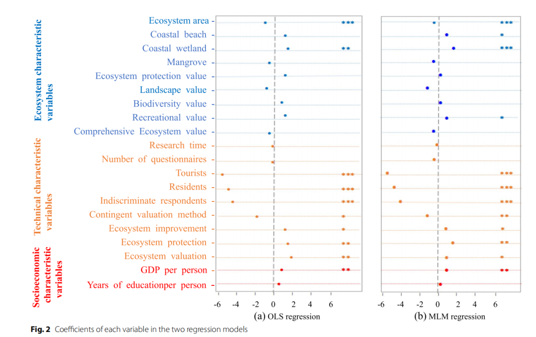 , V/ q0 J. Z- B8 O1 c! j: [ 基于1996年至2021年间对中国海洋生态系统服务偏好价值评估的实证研究,构建了一个用于价值转移的数据库。建立Meta回归模型,使用多层次分析模型(MLM)分析中国海洋生态系统服务的价值,考虑到数据在不同区域(层次)间可能存在的差异和联系。通过建立一个两级模型,即个体样本嵌套在地区(区域)层次内,研究控制了地区层面的影响,并探讨了不同因素对海洋生态系统服务价值估计的影响。并用运用转移误差来评估Meta回归方程的有效性。同时运用多元线性回归模型(OLS)进行分析,并进行对比。