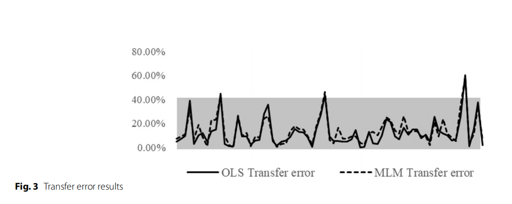 结果分析部分通过对比OLS和MLM模型的估计结果,讨论了不同因素对中国海洋生态系统服务价值估计的影响,并评估了模型的有效性。通过计算OLS与MLM的转移误差,发现所采用的meta模型能够较好地预测海洋生态系统服务的价值。这些发现对于理解中国海洋生态系统服务价值评估的变化驱动因素具有重要意义,并为未来的政策制定和研究提供了依据。 5 {, _: o5 q, o7 k% u