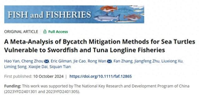 4 C+ u% I' x! @% S' X1 M 近日,上海海洋大学万荣教授课题组联合美国夏威夷太平洋大学、北卡罗来纳州立大学以及远洋渔业科学与技术战略创新团队等研究人员在揭示海龟兼捕减缓方法有效性研究方面取得新进展,该成果以《A meta-analysis ofbycatch mitigation methods for sea turtles vulnerable to swordfish and tuna in longline fisheries》为题发表于渔业领域顶级期刊《Fish and Fisheries》(doi: 10.1111/faf.12865)。 & q& l w7 ?0 T8 V& O: x* n