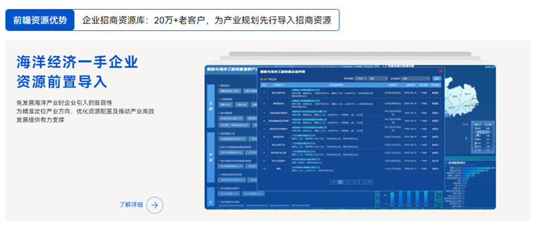 以前瞻智慧招商系统为例,通过多年来前瞻产业研究院服务2200+地方政府、产业园区的实战规划经验,结合自研的人工智能技术,可以对海洋经济企业、行业、市场需求等进行智能分析和预测,优化算法以提高招商准确性和效率。再通过前瞻智慧招商的先进的模型算法与数据清洗机制,按照产业链细分环节、集聚程度等要素,将处在不同环节/不同地区的头部企业标注在地图上,利用企业价值评测模型和智能推荐算法,挖掘与区域海洋经济产业发展相契合的高价值企业,让招商人员根据招商目的了解全国头部企业布局。 + k" f' ~# q6 e; d