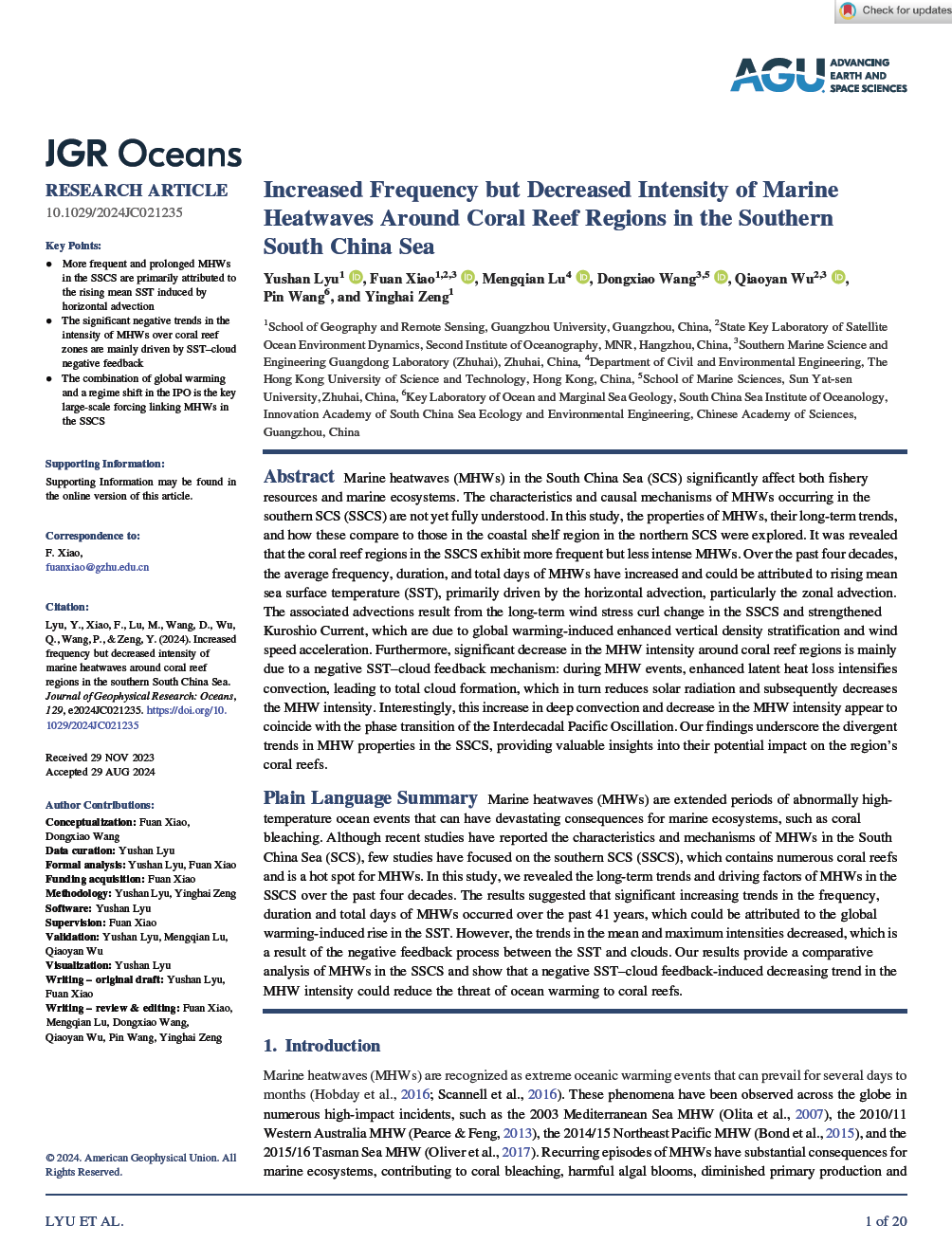 广州大学地理科学与遥感学院肖福安副教授指导硕士研究生吕玉珊在海洋学领域权威期刊Journal of Geophysical Research: Oceans发表题为“Increased Frequency but Decreased Intensity of Marine Heatwaves Around Coral Reef Regions in the Southern South China Sea”的研究成果。 5 U b" e9 C" z