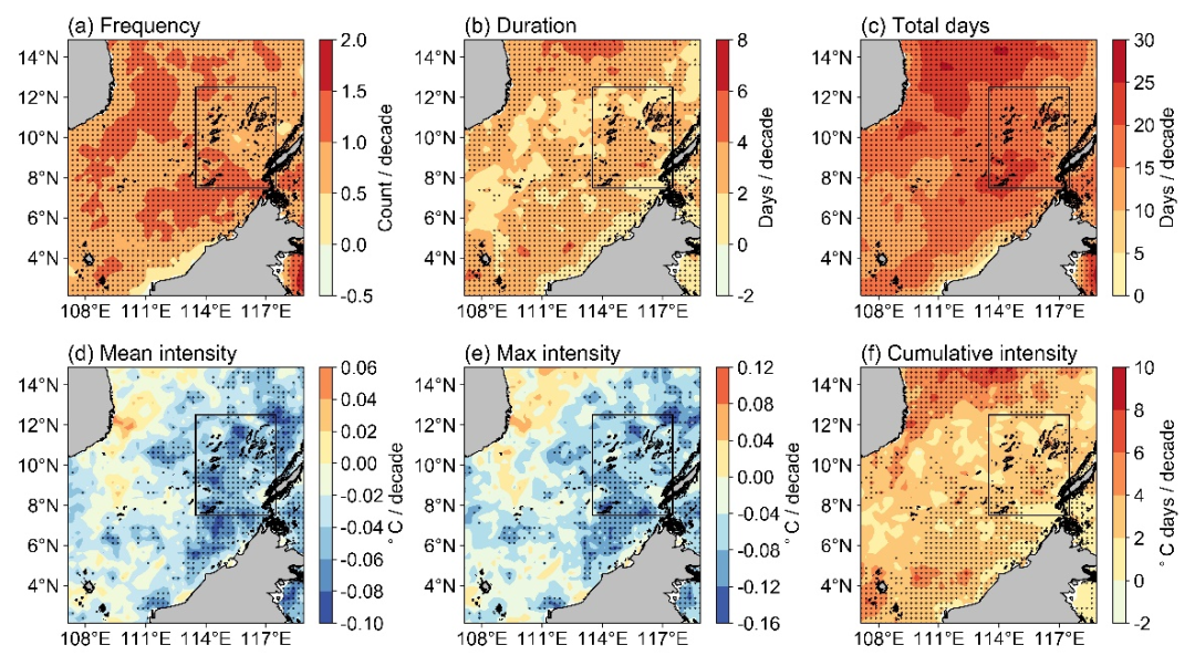 1 z% l9 i8 Q. W- C 图1. 1982-2022年南海南部海洋热浪 (a)发生频次、(b)持续时间、(c)总天数、(d)平均强度、(e)最大强度和(f)累积强度的变化趋势,打点区域表示通过0.05的显著性水平检验,黑色框线区域为珊瑚礁区域