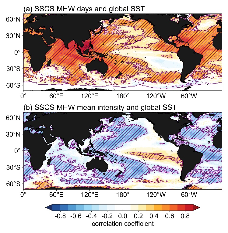 8 D5 p* m( P: s+ }* Z 图3. 1982-2022年南海南部海洋热浪 (a)总天数,(b)平均强度 与全球海表温度的相关性,填色为相关系数,紫色轮廓和阴影区表示通过0.05的显著性水平检验 ! M0 v5 Y, ~2 S3 W" b