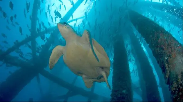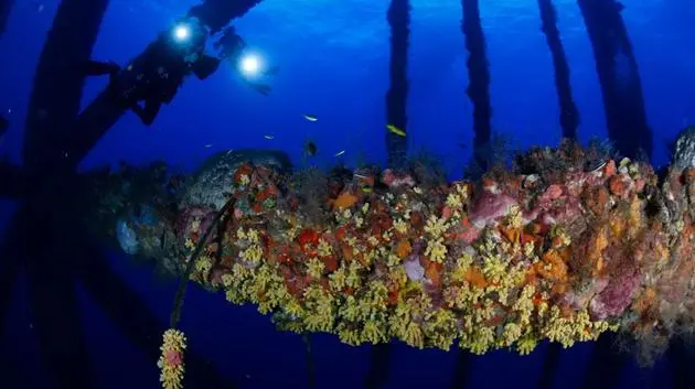 海洋钻井平台的海底部分是一个垂直钢架结构,随着时间的推移将逐渐变成珊瑚礁,栖息着各种海洋生物。