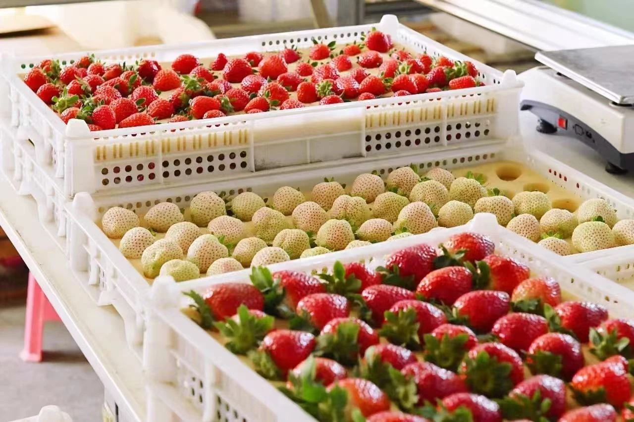 走进智能化温室大棚,科技感扑面而来。传感器实时监测着温度、湿度、光照等数据,智能灌溉系统精准调控水肥供给。在精心设计的立体栽培架上,黑珍珠、白色恋人、吻、粉玉等特色草莓品种长势喜人,红白相间的果实点缀在翠绿植株间,散发着诱人的果香。采摘工人们穿梭在其中,不一会儿手中的托盘就装满了颗颗个大饱满的新鲜草莓。