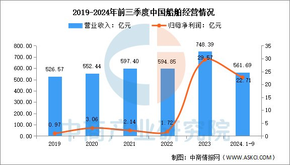 2024年前三季度实现营业收入561.69亿元,同比增长13.12%;实现归母净利润22.71亿元,同比下降11.32%。2023年主营产品包括船舶造修及海洋工程、机电设备,营收分别占整体的94.10%、2.58%。 数据来源:中商产业研究院整理 数据来源:中商产业研究院整理5.中远海控