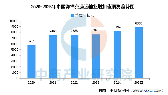 2024年实现增加值16135亿元,比上年增长9.2%。受政策利好和消费复苏驱动,以及海洋文旅供给优化和居民出游意愿增强等因素叠加,海洋旅游市场持续升温,邮轮旅游跃上新台阶,海洋旅游业实现较快增长。中商产业研究院分析师预测,2025年我国海洋旅游业增加值有望超过17000亿元。 数据来源:自然资源部、中商产业研究院整理4.海洋交通运输业
