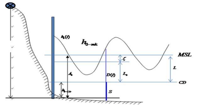 M! Z' V, i; m2 h3 R 为了海岸带区域陆海观测技术测绘成果检核的需要,在陆基验潮站,均需布设水准点,于是,水位零点,进一步地,深度基准面、净空参考面,以及表示海底地形的水深信息均可换算至国家高程基准中表达。特别地,深度基准面与国家高程基准的差异表示为L0。当然,在岛基验潮站,也通常埋设水准点,与陆基验潮站一样除用于监测验潮设备零点稳定性外,主要功能是平均海面和高程传递。