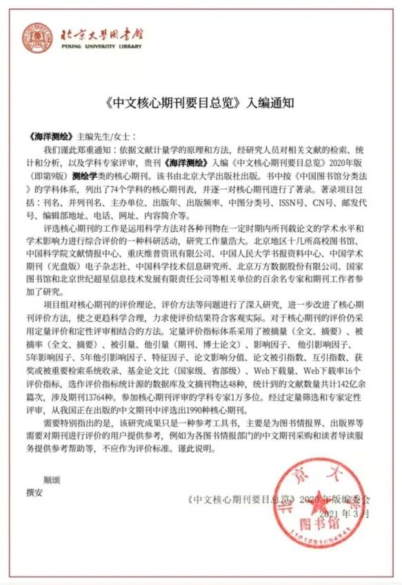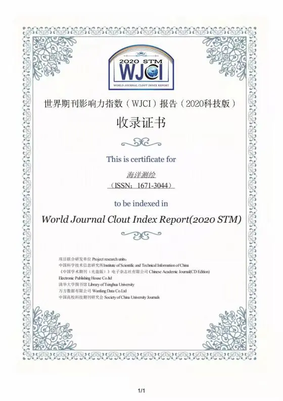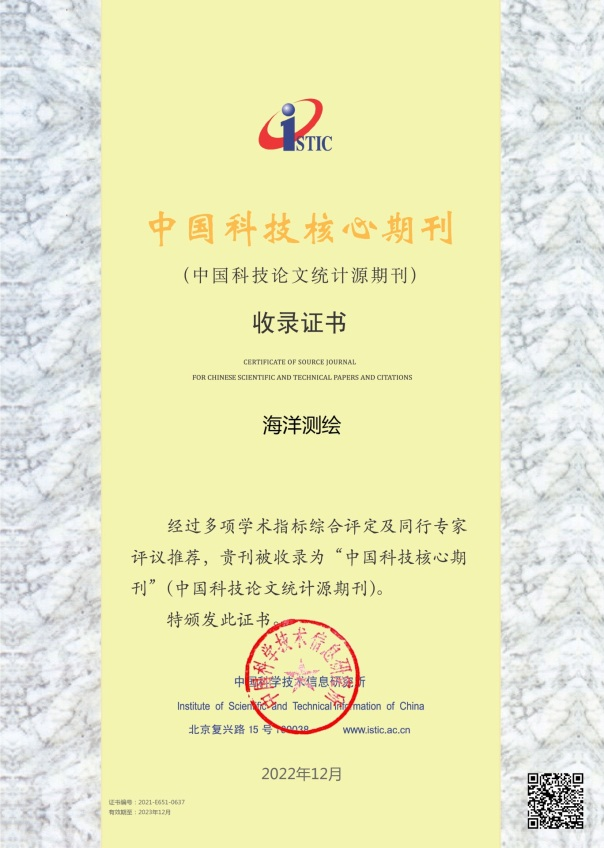 # b4 ]* i4 t3 |; q6 l 《海洋测绘》创刊42年来,经过几代出版人的坚持坚守、默默耕耘和接续奋斗,狠抓论文质量和规范化管理,全方位报道了我国改革开放40余年来海洋测绘事业和海洋环境建设的新理论、新技术、新方法、新设备等发展动态。期刊的核心竞争力、社会影响力、专业贡献率不断提升,得到上级机关和业界的一直好评和肯定,先后获得“中国科技核心期刊”“中文核心期刊”“全国优秀测绘期刊”“海军优秀期刊”等荣誉,并被“世界期刊影响力指数报告目录”“地理资源高质量科技期刊分级目录”“中国科学引文数据库”“中国期刊全文数据库”以及“俄罗斯《文摘杂志》”“日本《日本科学技术振兴机构数据库》”“美国《艾博思科数据库》”“乌利希期刊指南”等国内外数据库收录。 1 k' k* T" a' f2 k) r3 `' l: Q