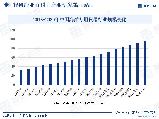 摘要:近些年来,随着我国海洋相关政策逐步落地实施,国内水产养殖、海洋生物等海洋经济产业均加速发展,海洋专用仪器应用需求呈现不断上升态势,吸引了越来越多资本开始深耕海洋专用仪器领域,使得产业得以进入高速发展阶段。数据显示,2024年我国海洋专用仪器行业市场规模已从2013年的33.2亿元增长至68.38亿元。