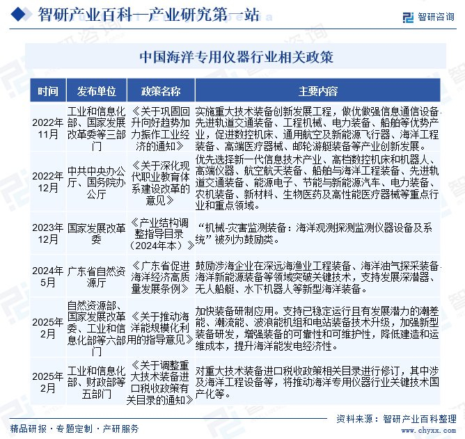 近年来,我国政府高度重视海洋经济的发展,将海洋强国战略作为国家重大战略之一,出台了《产业结构调整指导目录(2024年本)》《关于推动海洋能规模化利用的指导意见》等一系列政策文件着力提升海洋工程装备自主研发能力,加速推动海洋专用仪器行业向高端化、智能化方向发展。
