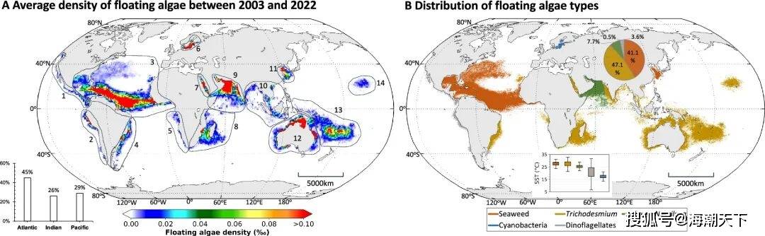 : b0 g: D1 i/ l. j/ L; S( B 根据研究,海藻的分布主要集中在热带和亚热带海域,覆盖的总面积达到4380万平方千米,占全球海洋表面积的12%。这些海藻带广泛分布在大西洋、太平洋和印度洋等主要海域,而在北极和南极海域则未能发现显著的海藻繁盛现象。