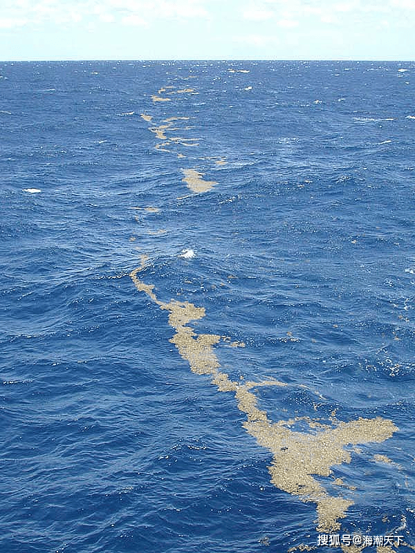 上图:马尾藻在海面绵延数英里。这些漂浮的海藻团块,在墨西哥湾暖流带来的强风和海浪作用下聚集在一起,形成长长的带状分布。照片由美国国家海洋和大气管理局(NOAA)的海洋探索项目于2002年8月9日拍摄。