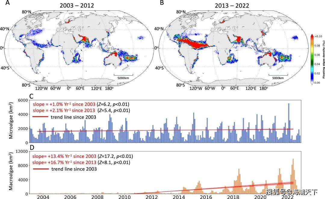 ▲上图:全球海洋漂浮藻类(FA)密度的十年际变化对比。图中对比了2003-2012年(图A)与2013-2022年(图B)两个阶段全球漂浮藻类的密度分布。图C与图D分别揭示了过去二十年间微型藻类结垢与大型藻类毯丰度的变化趋势:其中垂直细线表示月平均值,红色阴影线展示了去季节性后的趋势线及95%置信区间。标注的Theil-Sen斜率、p值以及双侧Mann-Kendall检验的Z统计量,从数据上证实了大型藻类增长的显著性。论文出处:Qi, L., Wang, M., Barnes, B.B. et al. (2025)