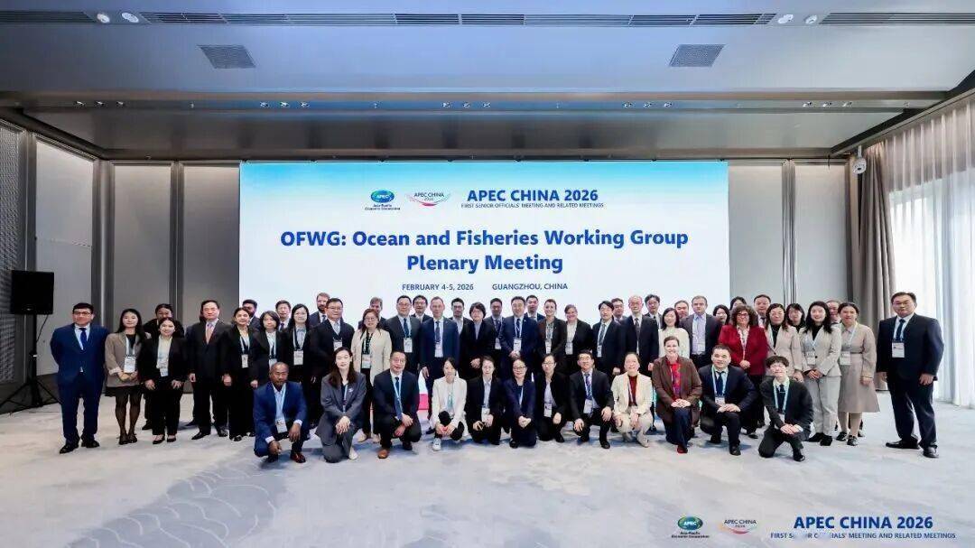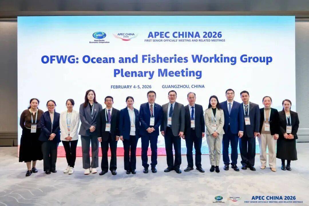 2026年2月4-5日,第25次APEC海洋与渔业工作组(OFWG)会议在广州成功举办。来自澳大利亚、加拿大、智利、中国、中国香港、日本、韩国、新西兰、巴布亚新几内亚、秘鲁、菲律宾、俄罗斯、中国台北、泰国、美国、越南等16个APEC经济体以及蒙特利湾水族馆、中国海洋发展基金会等社会组织代表共70余人参会。中方代表团由自然资源部国际合作司副司长王安涛,农业农村部渔业渔政管理局副局长孙海文,自然资源部南海局副局长王宏斌,自然资源部第三海洋研究所所长(APEC海洋可持续发展中心主任)张海峰、副所长陈彬,以及来自海洋三所(APEC海洋可持续发展中心)、南海局、海洋一所、国家海洋环境预报中心、自然资源部海岛研究中心等单位代表共28人组成。 5 z4 i# n7 b! [# M! R W9 N; C. g