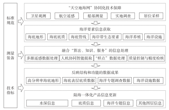 从每一类海洋要素特点出发,梳理测量平台装备、理论技术、标准规范等现状情况,分析高新技术发展以及在测绘领域不断渗透,对海洋要素采集、处理、分析、表达、管理及成果服务的重要影响。围绕产品设计内容和指标要求,从“天空地海网”协同化技术保障、数据获取、融合“算法、知识、服务”的信息处理、信息更新等方面,系统研建面向工程应用的海洋要素综合采集获取技术,见图3。 " G: C0 a% c% ^" v3 v# o/ d! y% e