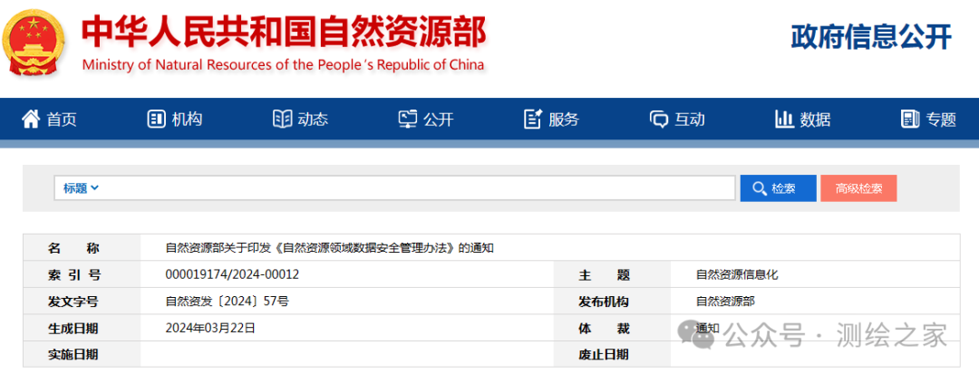 $ r: Y: l$ \2 K& ~ e+ ? 各省、自治区、直辖市自然资源主管部门,新疆生产建设兵团自然资源局,上海市海洋局、福建省海洋与渔业局、山东省海洋局、广西壮族自治区海洋局,国家林业和草原局,中国地质调查局及部其他直属单位,各派出机构,部机关各司局: 经国家数据安全工作协调机制批准,部领导同意,现将《自然资源领域数据安全管理办法》印发给你们,请结合实际认真贯彻执行。自然资源部2024年3月22日4 I- k) \. j/ ]8 N0 Q