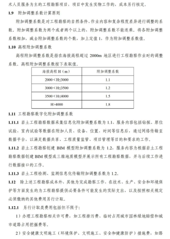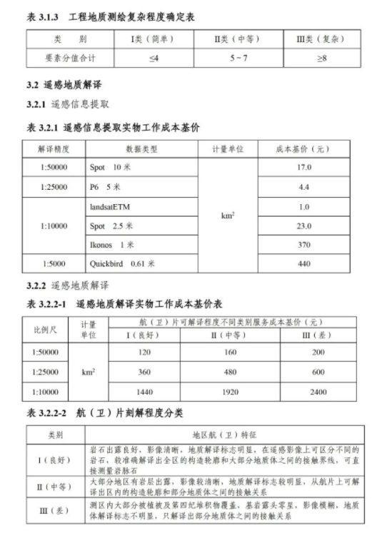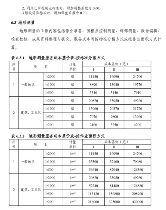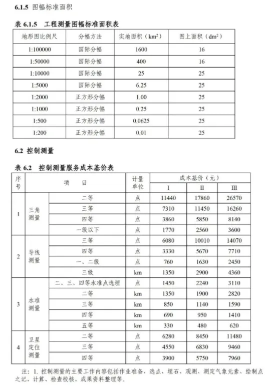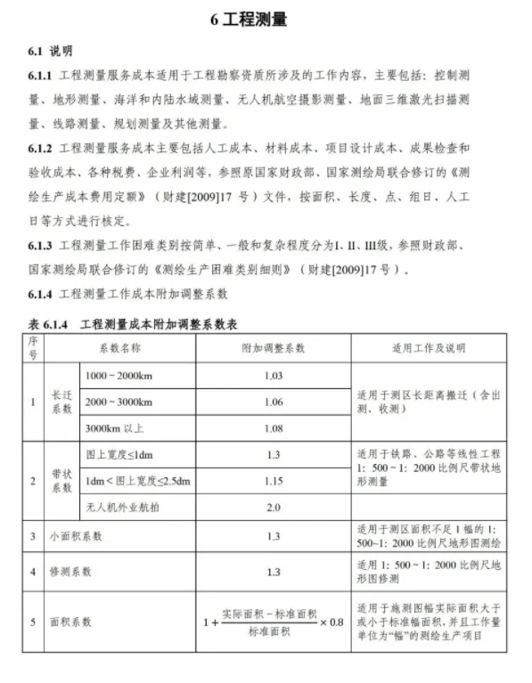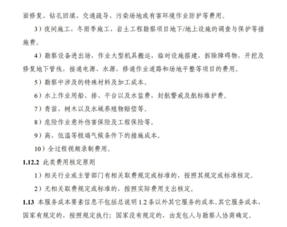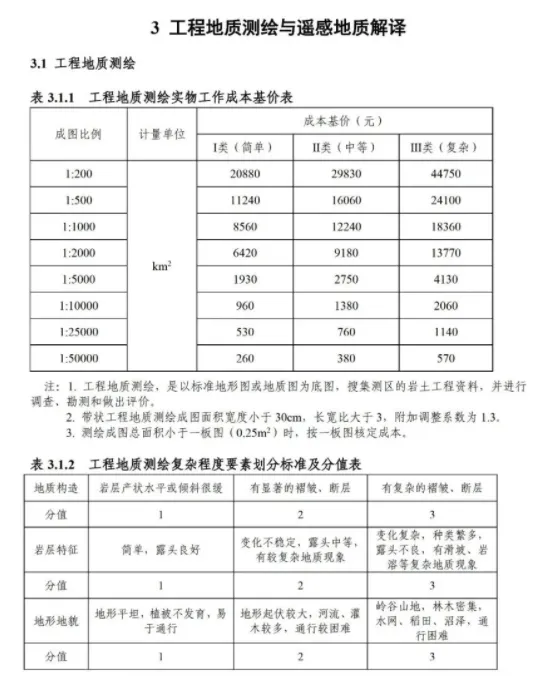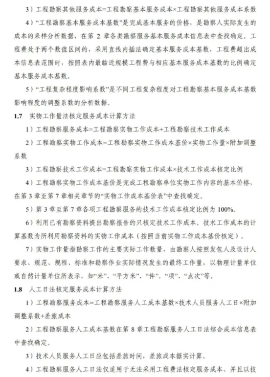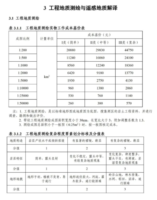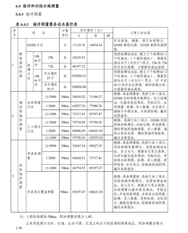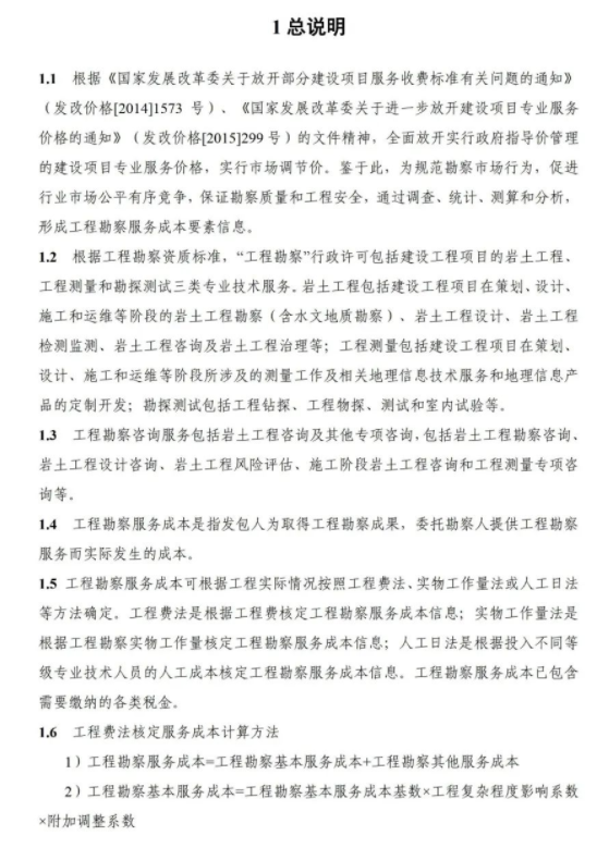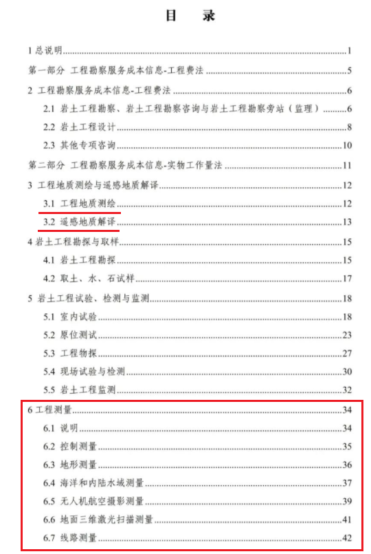 《要素信息》分为八章,相关成本测算分为工程费法(其包含岩土工程勘察、岩土工程勘察咨询与监理、岩土工程设计和专业工程咨询)、实物工作量法(其包含工程地质测绘与遥感地质解译、岩土工程勘探与取样、岩土工程试验/检测与监测、工程测量、水文地质勘察)及人工日法三类。除传统的岩土工程试验、测试和工程测量项目外,实物工作成本包括了土的易溶盐及导热系数等室内试验、多功能数字式孔压静力触探试验、温度测量等工程物探、海洋和内陆水域测量、无人机航空摄影测量、地面三维激光扫描测量、规划测量等以新技术方法为主的专业技术服务项目。考虑到我们平台读者群体的对象,摘取了工程测量、海洋和内陆水域测量、无人机航空摄影测量、地面三维激光扫描测量、规划测量等部分相关内容,供大家参考。
