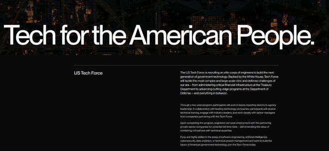 $ B! y- D5 S2 K! g0 W: Q 简单来说,“美国技术部队”将由约1000名技术专家组成,他们受聘于各机构,旨在加速人工智能的实施,并解决联邦政府面临的最关键的技术挑战。 5 K7 R2 p( h5 C, S1 H6 l" `
