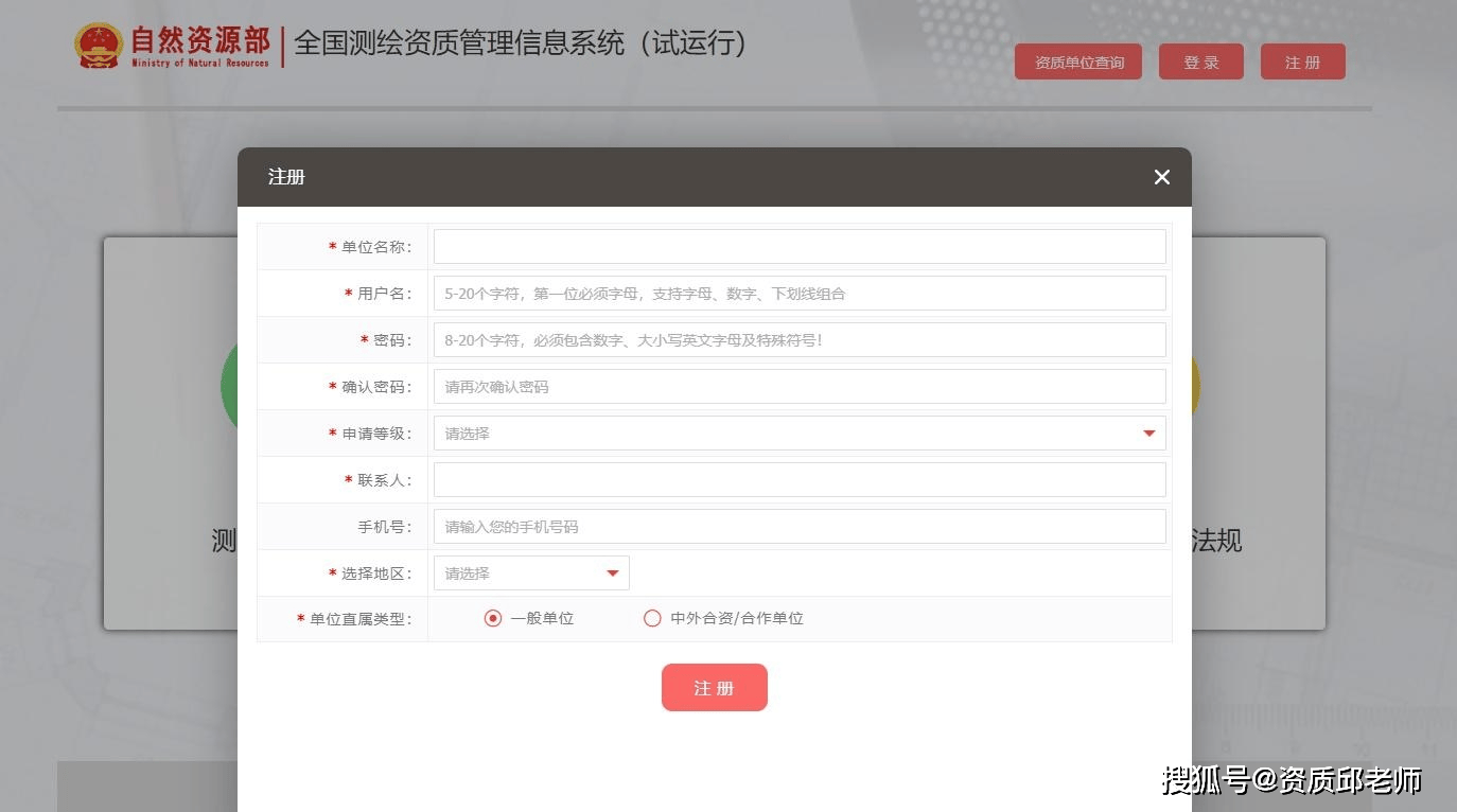 # J, y4 R1 @+ A& H7 r 新注册单位只需网上搜索全国测绘资质管理信息系统(试运行)进入选择注册,填写完善基本信息。