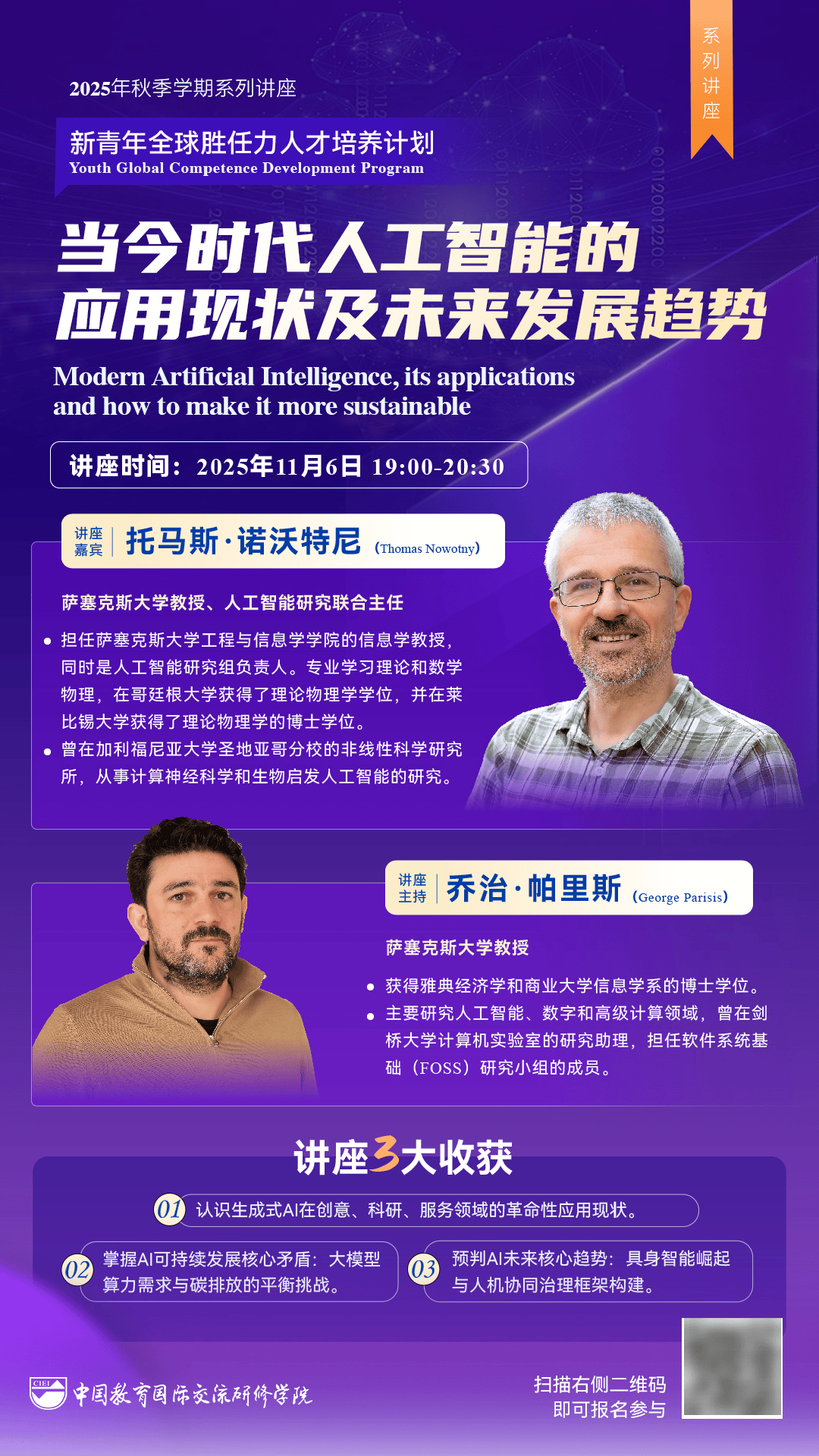 “走向世界的新青年”系列讲座2025年秋季学期第三场特邀英国萨塞克斯大学人工智能联合主任、信息学教授托马斯·诺沃特尼(Thomas Nowotny),带来主题为“当今时代人工智能的应用现状及未来发展趋势”的深度分享。托马斯教授将结合其在人工智能、计算神经科学与可持续发展领域的多年研究,系统解析生成式AI的广泛应用、AI与可持续发展的平衡之道,以及人机协同的未来图景。 . N6 g5 o2 L( C* v' K
