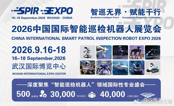 关于 SPIR Expo 2026:中国国际智能巡检机器人展览会(SPIR Expo)是亚太地区规模最大、最专业的智能巡检领域全产业链盛会。2026年展会预计展览总面积将达80,000平方米,汇聚超800家全球领军企业,吸引逾50,000名专业观众。