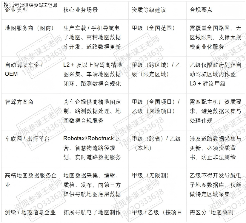 ! g& J1 Y5 E ^) ^1 o0 B 4、测绘与地理信息企业:传统测绘单位转型高精地图业务,或专门从事导航电子地图制作的测绘企业,必须取得对应资质方可开展业务,甲级可全国作业,乙级有作业范围限制。 其他涉导航地图数据生产企业:如为物流、矿山、港口等特定场景开发专用导航地图,或从事导航地图数据加工、更新服务的企业,只要涉及导航电子地图制作核心环节,均需办理资质。 7 T3 z4 M" T% G7 @ l! K