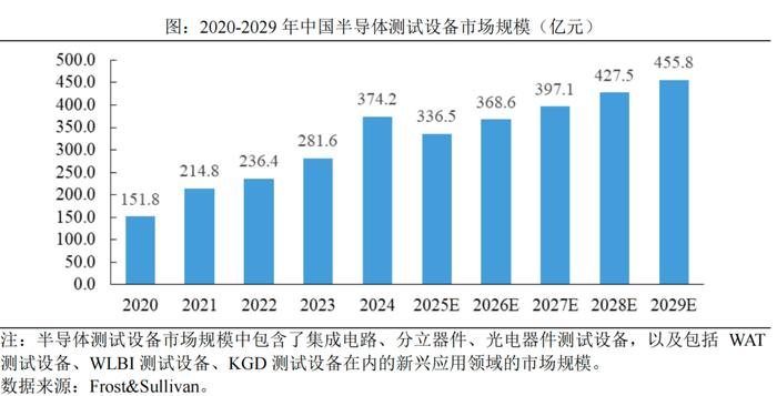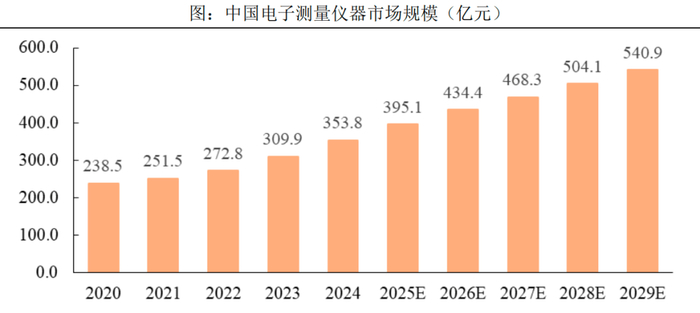 根据Frost&Sullivan数据,中国电子测量仪器市场规模将由2020年的238.5亿元增长至2024年的353.8亿元,年复合增长率达10.4%。而半导体测试设备市场规模预计2025年至2029年的年复合增长率为7.9%,于2029年达到455.8亿元。 " b4 Z4 c* G! q- x7 z