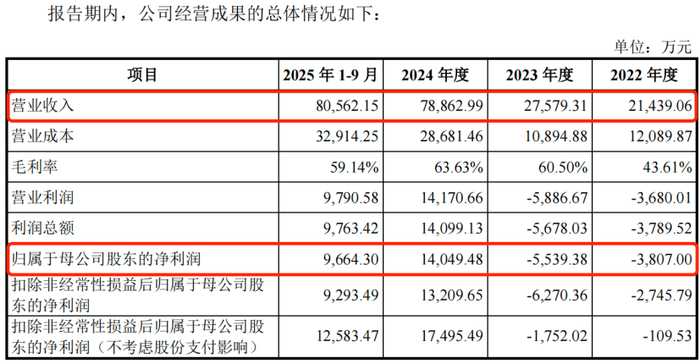 . I& n! b) T- i 招股书显示,2022年至2025年1-9月(以下简称“报告期”),联讯仪器的营业收入分别为2.14亿元、2.76亿元、7.89亿元和8.06亿元;归母净利润分别为-3807万元、-5539.38万元、1.40亿元和9664.30万元。