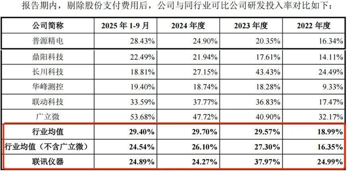 图 / 联讯仪器招股书报告期内,剔除股份支付费用后,同行业可比公司的研发费用率均值分别为18.99%、29.57%、29.70%和29.40%。在2024年和2025年前9月,联讯仪器的研发费用率低于行业均值。 7 t. t7 q7 D9 h