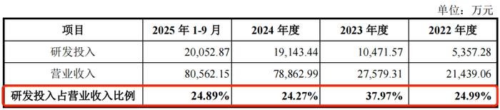 , m. ~8 d3 \7 e0 R5 I! u7 }' v, X6 P) n( { 招股书显示,报告期内,公司的研发费用金额分别为5357.28万元、1.05亿元、1.91亿元和2.01亿元,占营业收入的比例分别为24.99%、37.97%、24.27%和24.89%。