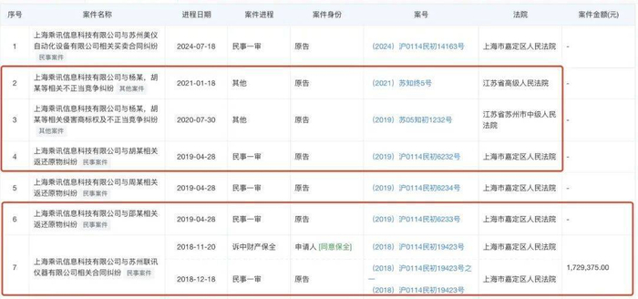 Y' n0 k0 P$ V H! F. I9 W 「创业最前线」注意到,胡海洋与前东家上海乘讯存在不少纠纷。公开资料显示,2018年以来,上海乘讯以商标纠纷、返还原物纠纷、合同纠纷、民间借贷等理由,将联讯仪器、胡海洋、邵毅男等主体告上法庭。