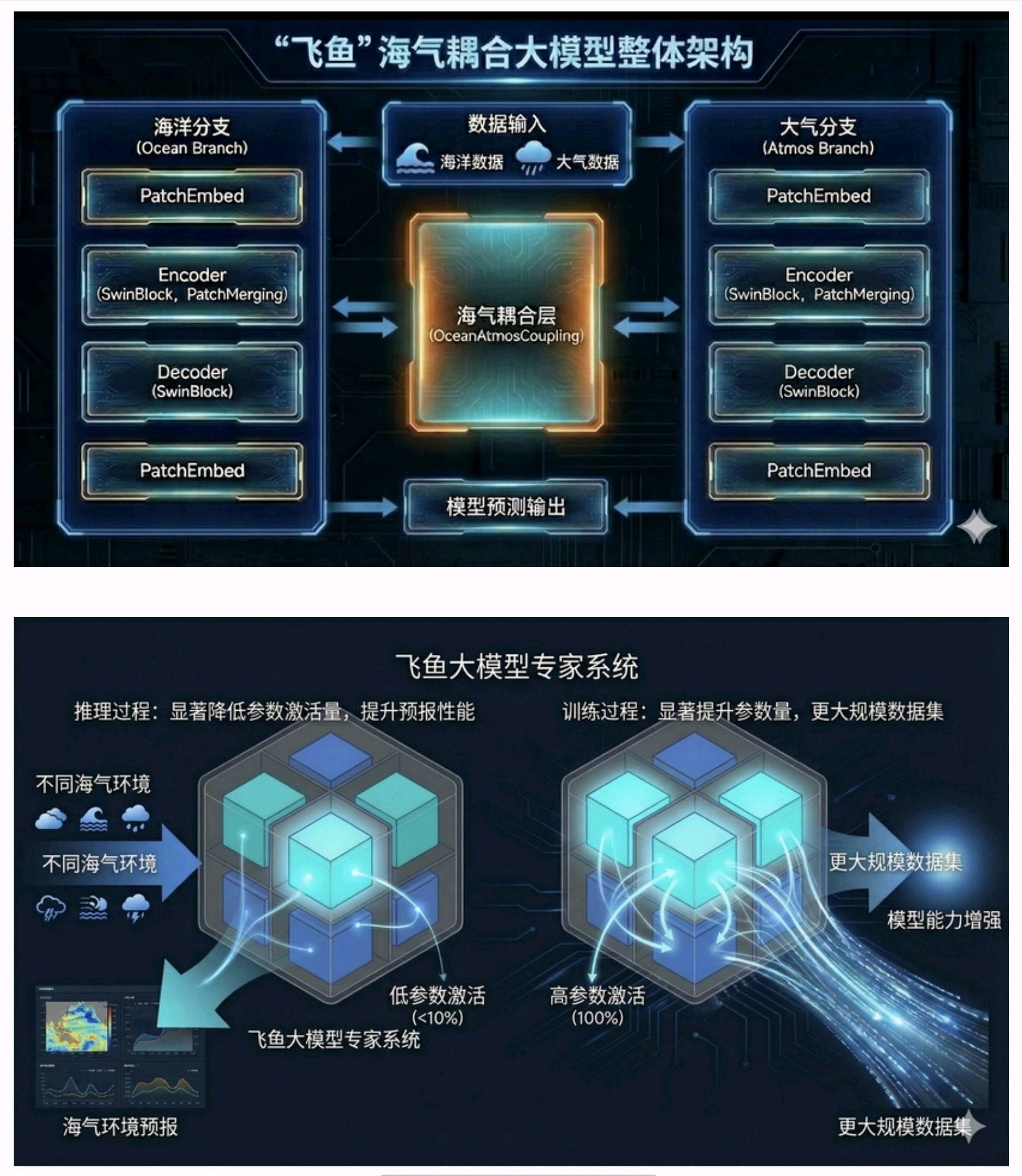 其次,该模型让海洋和大气能“双向交流”。以前同类模型要么只研究大气,要么只研究海洋,而“飞鱼-1.0”把物理规律和AI结合,采用创新的架构,可以模拟大气和海洋之间能量、动量的互相影响,对台风、海温等的预报精度大大提升。