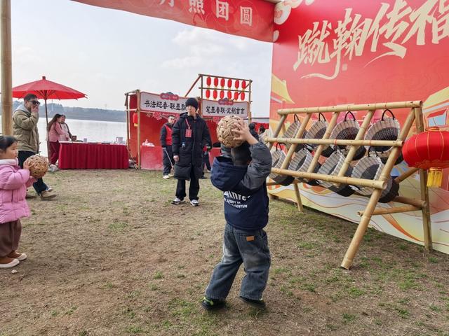 " F1 Z5 D; X1 K7 N5 b" h* x 江边围炉煮茶区,游客在袅袅茶香中享受惬意时刻;童年游戏区,丢沙包、套圈、滚铁环等经典游戏轮番上演。但最热闹的,是干塘摸鱼区,洲上劈出一口不大不小的池塘,游客们可以亲水下塘,体验“年年有余”的传统寓意。