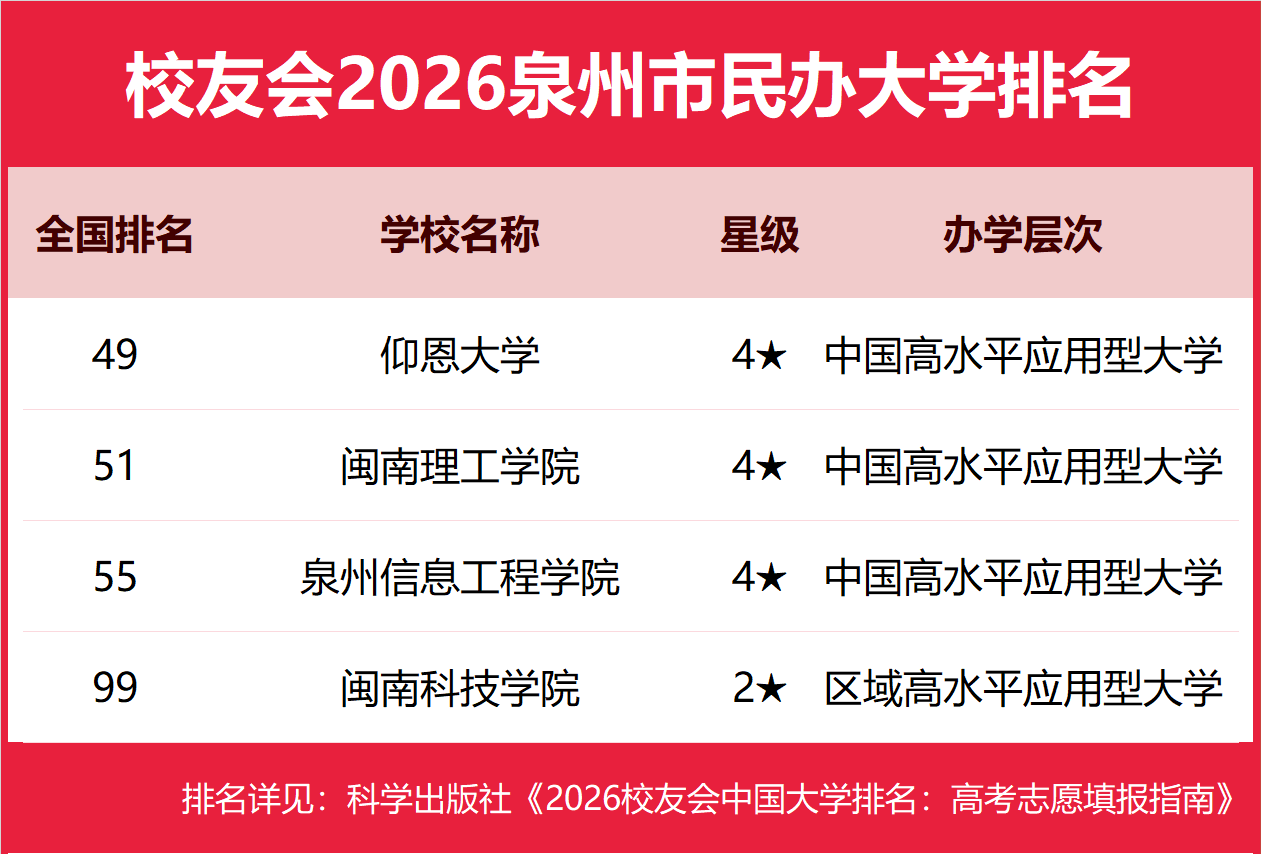 ( w9 z4 ?3 R: [$ z 校友会2026泉州市民办大学排名,仰恩大学第一,闽南理工学院、泉州信息工程学院前三 . q O& ?4 v' }0 D! \/ }" A/ E" v