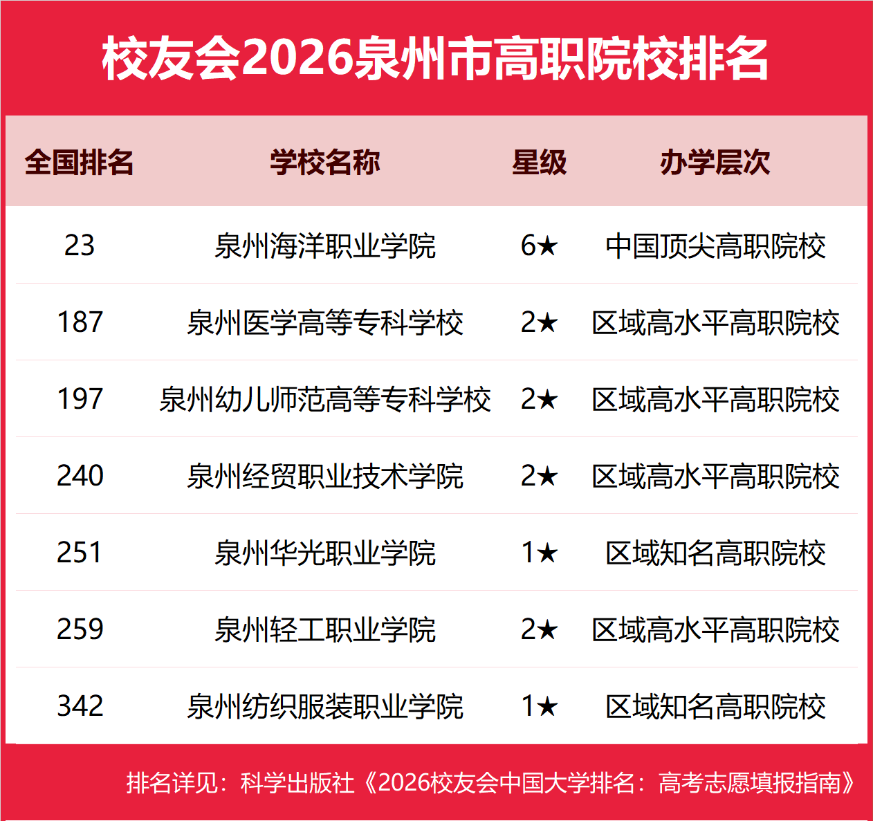 2 W! c3 F4 {! Q. A( e+ G5 z 校友会2026泉州市高职院校排名,泉州海洋职业学院第一,泉州医学高等专科学校、泉州幼儿师范高等专科学校前三 ) l, l; \9 [+ }! o% Z& ]3 o% ]; z0 ]