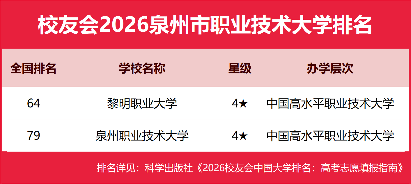 校友会2026泉州市职业技术大学排名,黎明职业大学第一,泉州职业技术大学前三