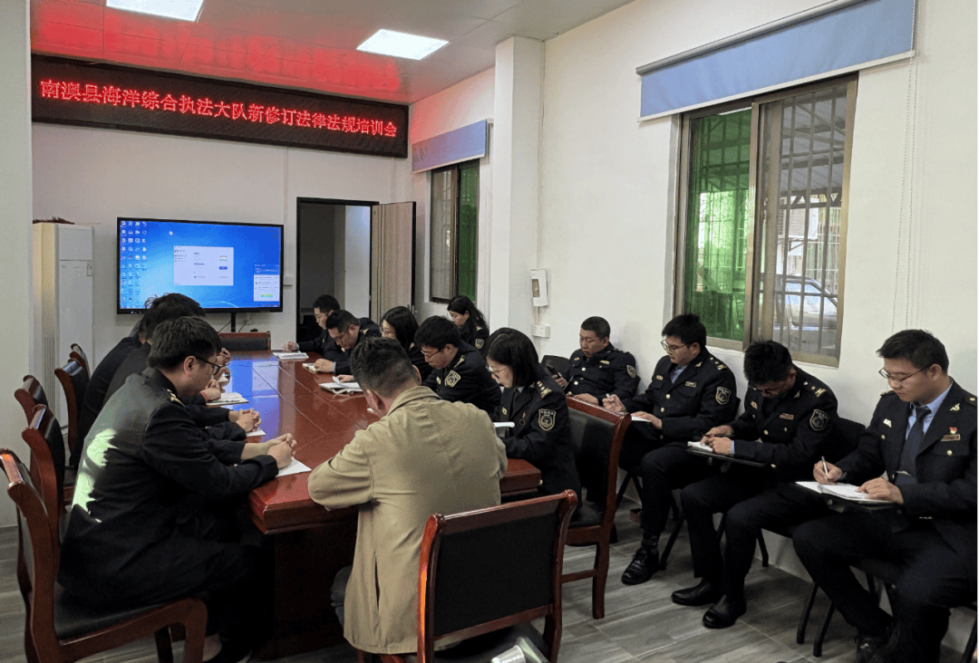 : a$ x: g# r* y4 A0 U 随后,会议围绕新修订施行的法律法规开展专题培训,大队领导及法制审核骨干重点解读了新修订的《中华人民共和国渔业法》《中华人民共和国渔业港航监督行政处罚规定》和新颁布的《行政执法监督条例》。会议指出,新修订的《渔业法》进一步强化了渔业资源保护与执法威慑;《中华人民共和国渔业港航监督行政处罚规定》优化了处罚程序与衔接机制,提升渔业港航安全监管的可操作性;《行政执法监督条例》则着力规范执法行为、加强内部监督,推动执法权力阳光运行。三部法律法规共同为提升海洋综合执法效能奠定了法治基础。 2 b+ \: p% n( T) w- ~5 Q3 R2 {